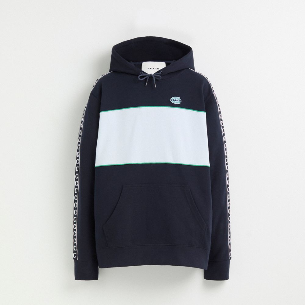 This colorblock hoodie is crafted of soft cotton. Featuring our Coach stamp and Signature tape inspired by retro-soccer designs, the sporty classic-fit pullover has a hand-warming kangaroo pocket and is finished with a banded hem and cuffs.