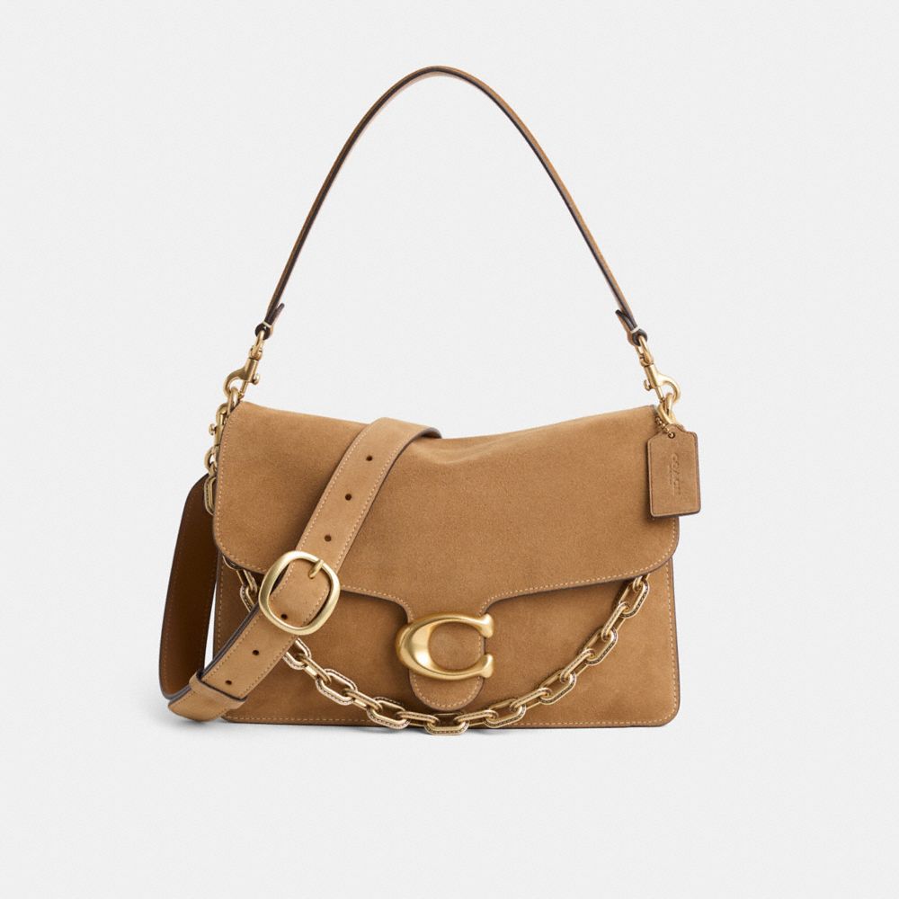 A modern take on an archival 1970s Coach design, our structured Chain Tabby shoulder bag is crafted of velvety suede. Finished with our Signature hardware for an iconic touch, the roomy 30 has space for all the essentials including an iPad, inside multifunction organizational pockets and a convenient outside zip pocket for easy access items. The versatile design is finished with three detachable straps to carry by hand, wear snug on the shoulder with the elegant stitched chain-link strap and short leather strap or go hands-free with the long leather crossbody strap.