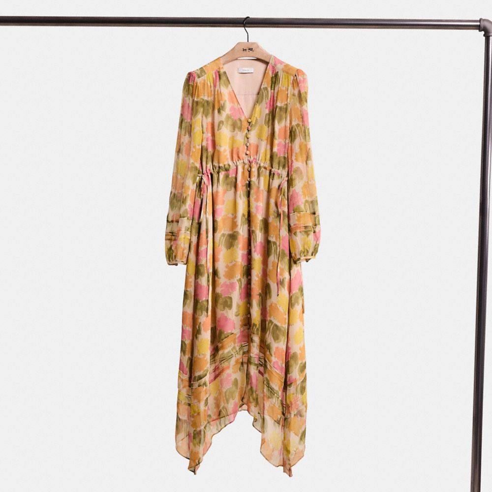 Bring fresh florals to your day with this long dress featuring a bright watercolor print reimagined from an archival 1960s illustration by Bonnie Cashin, Coach's first head designer. The lightweight and breezy silk design is detailed with a button-front, a gathered waist for a slightly A-line fit and a handkerchief hem.