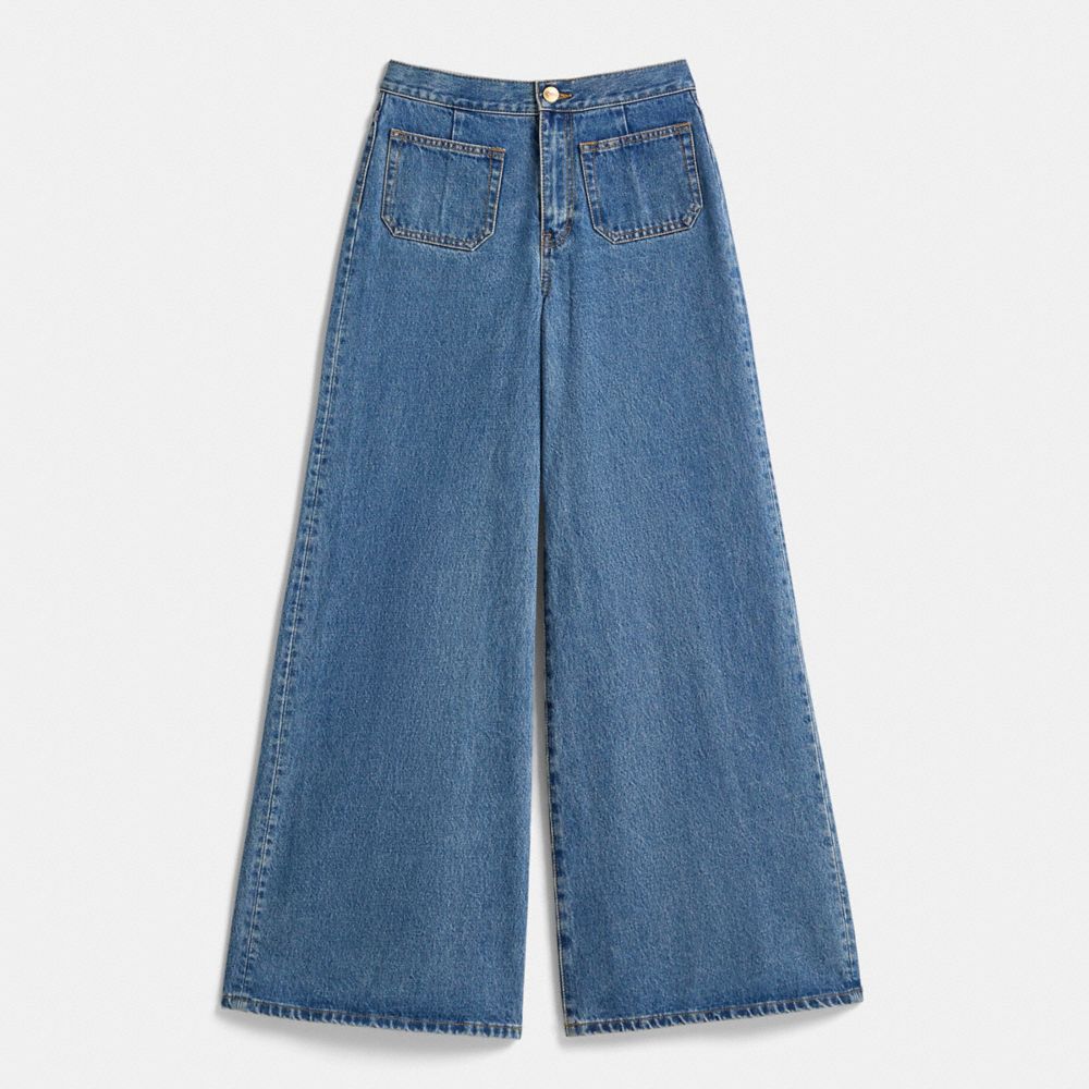 Take casual to sophisticated with these soft cotton denim pants. The wide leg style is finished with patch pockets front and back.