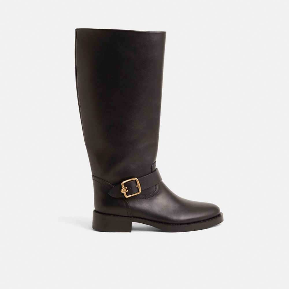 Featuring a polished buckle detailed with our Signature for a subtle heritage touch, our equestrian-inspired smooth leather Madeline riding boot is a wardrobe staple. The tall silhouette is finished with side zip for easy on-and-off and rubber lug sole for increased traction. This boot is designed with an extended calf width for a roomier fit.