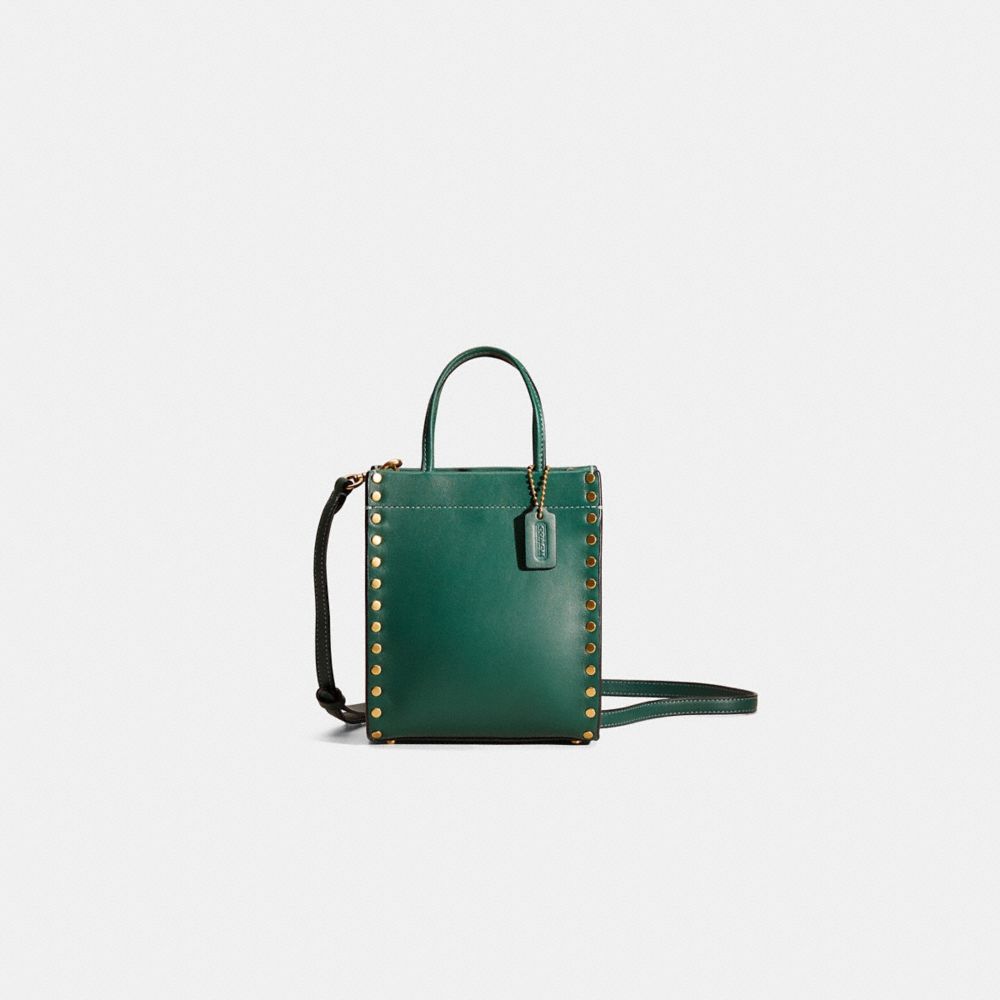 Reimagined for today, this mini tote is based on the iconic "Cashin Carry" from 1969, a top-handle style by Coach's first lead designer, Bonnie Cashin. Crafted of buttery soft glovetanned leather detailed with gleaming polished border rivets, the petite style is secured by a magnetic snap closure.
