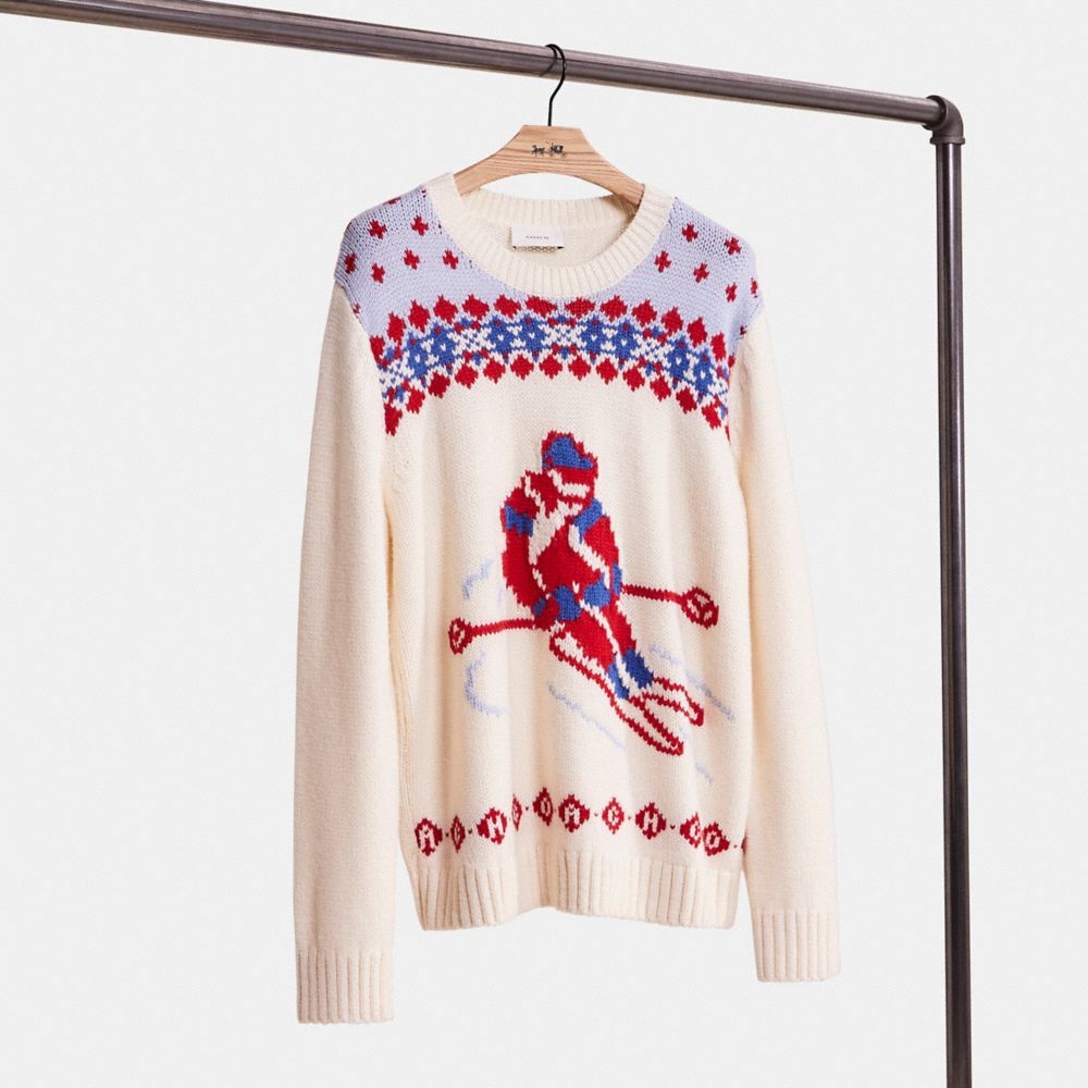 Be ready for a mountain getaway (or a city lunch) with this fair isle knit crewneck sweater. Crafted of warm wool, it features a speedy downhill racer.