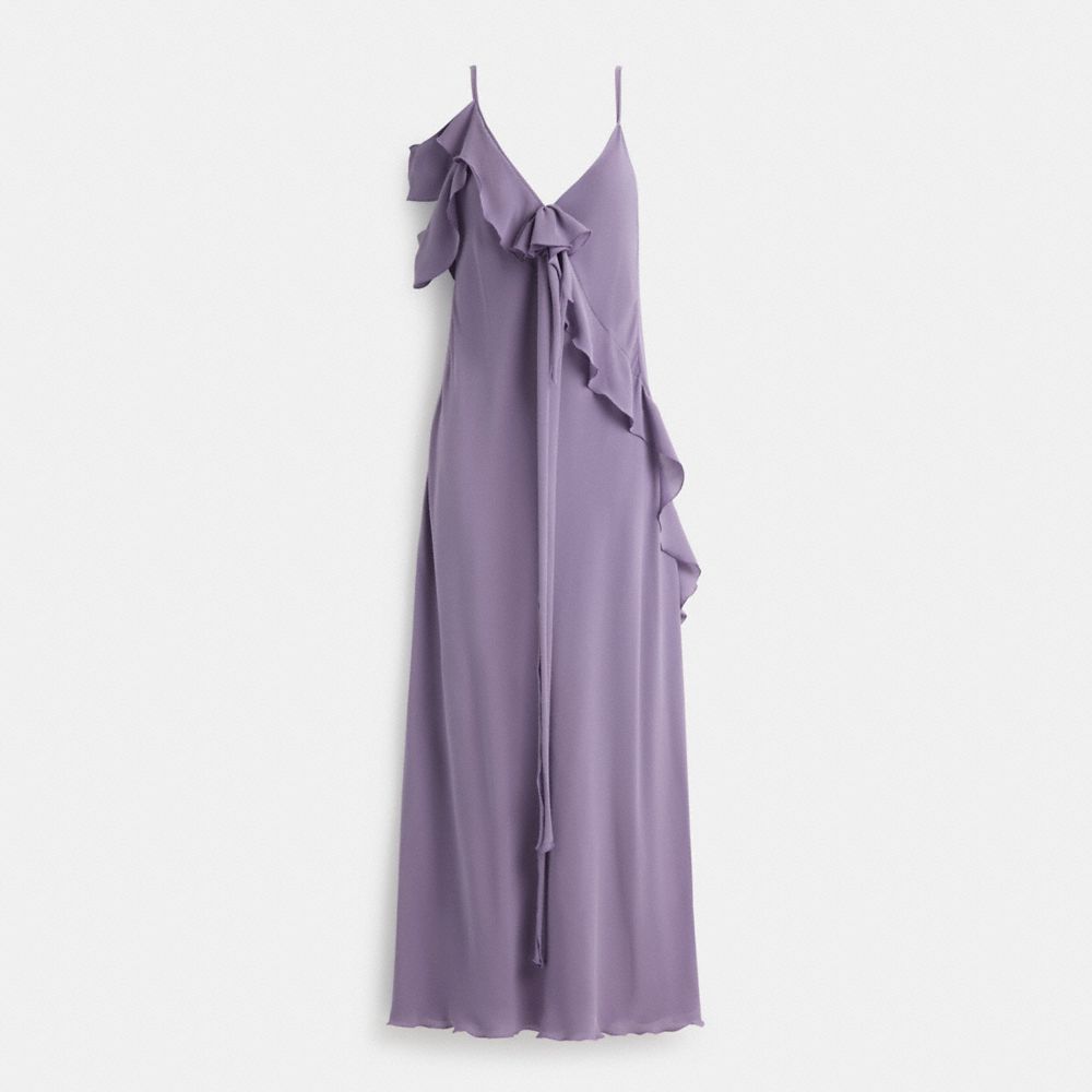 Cascading ruffles and a rosette detail add airy romance to this long bias-cut silk dress. The dreamy asymmetrical style features delicate spaghetti straps, a V-neckline and a scoop-back for a feminine finish.