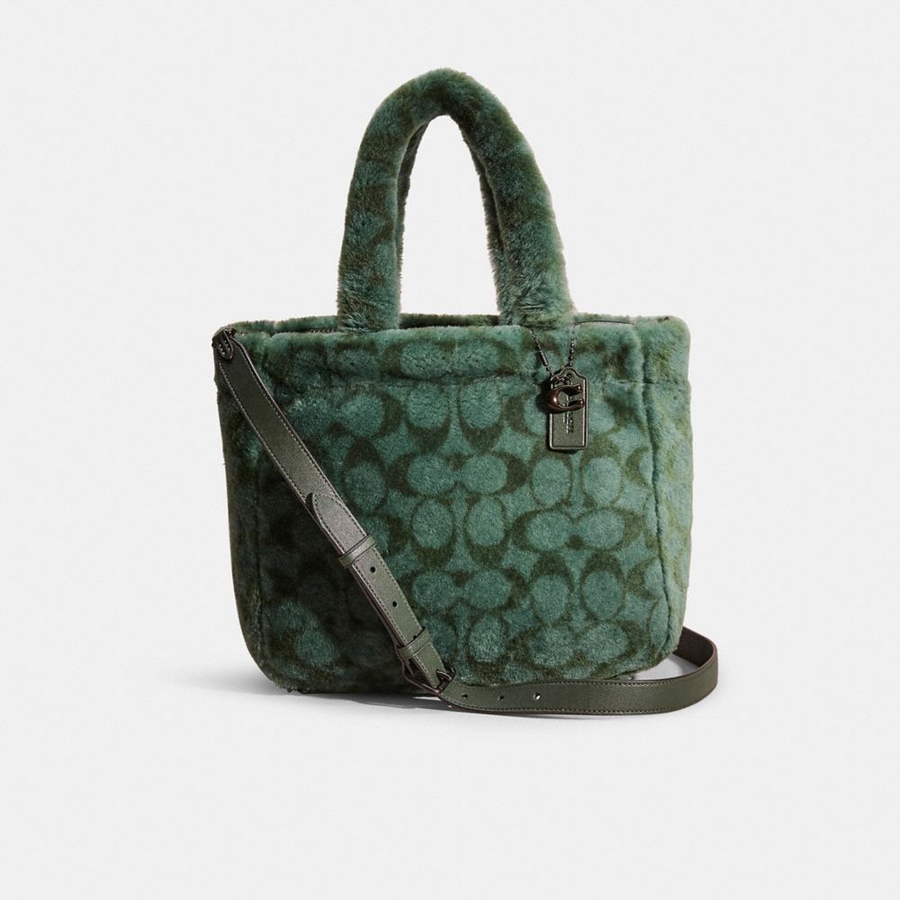 Our Tote 28 is a cozy-luxe style crafted of plush dyed shearling printed with our iconic Signature pattern. Finished with supple nappa leather trim, this spacious carryall features an inside pocket and a detachable strap for hands-free wear on the shoulder or crossbody.
