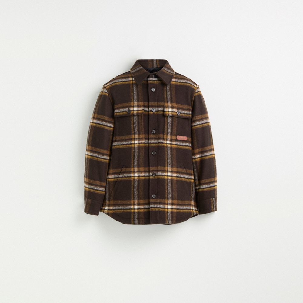 Check it out, this relaxed tweed shirt jacket features a heritage plaid and a lightweight fill for extra warmth. Perfect for layering in seasonal temperatures, the medium weight style is finished with chest pockets and our leather Coach Badge.
