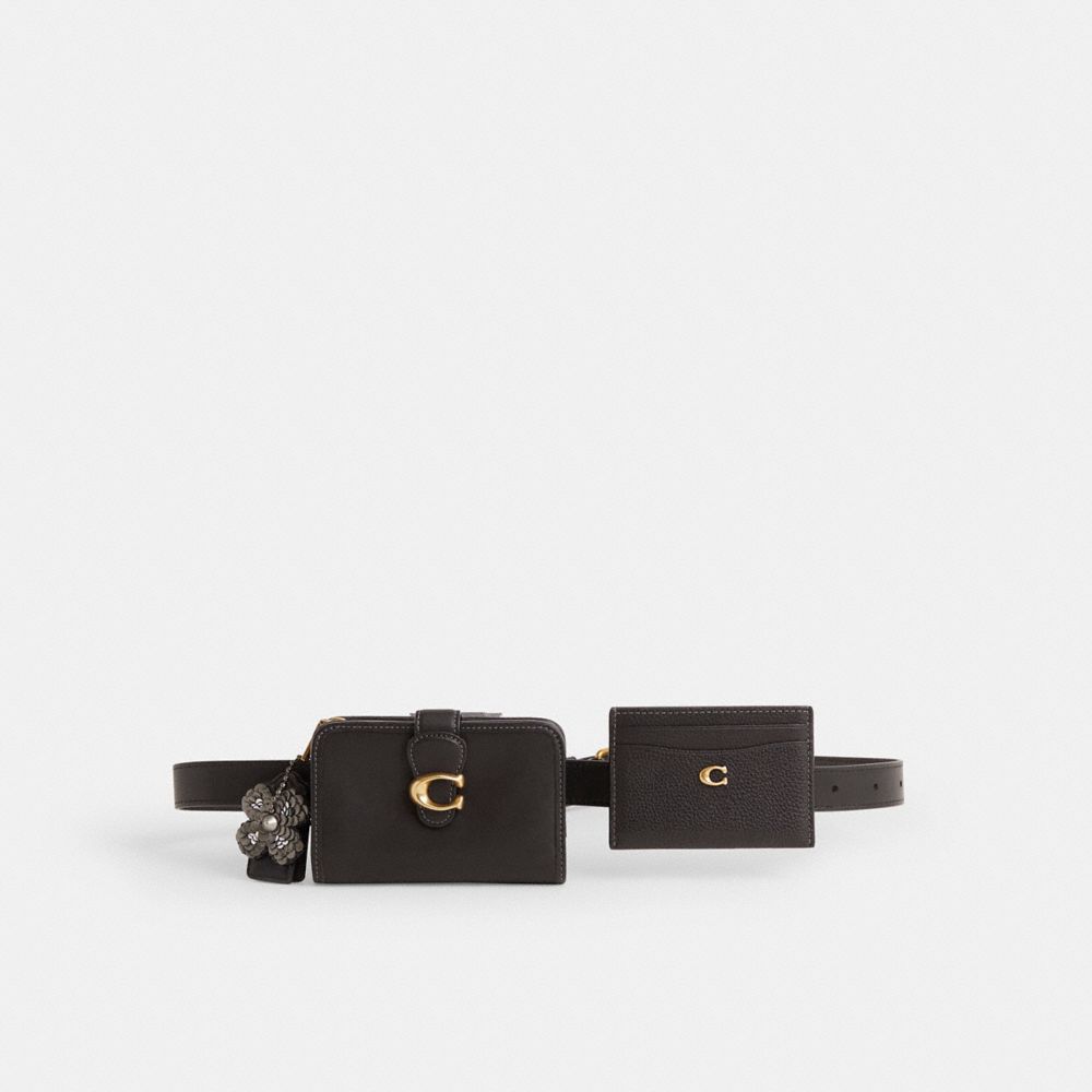 Reimagined as an ultra-convenient, cool belt bag by Savannah Sutton, this hands-free style has been expertly cleaned, conditioned and restored. Our talented craftspeople Angel Penaloza, Ella Mulley and Antonio Hernandez attached belt loops to the backs of the wallet and card case, threaded them onto a repurposed leather belt, polished the wallet, repaired the edgestain on the belt and added a playful repurposed charm. Featuring an exterior zip pocket for coins, earbuds and other small essentials, the smooth leather bi-fold Tabby medium wallet unsnaps to reveal ten card slots, slip pockets and a full-length bill compartment. Crafted of polished pebble leather detailed with our Signature hardware, the card case has five card slots and a center compartment to hold more cards or cash and secures with a zip closure.