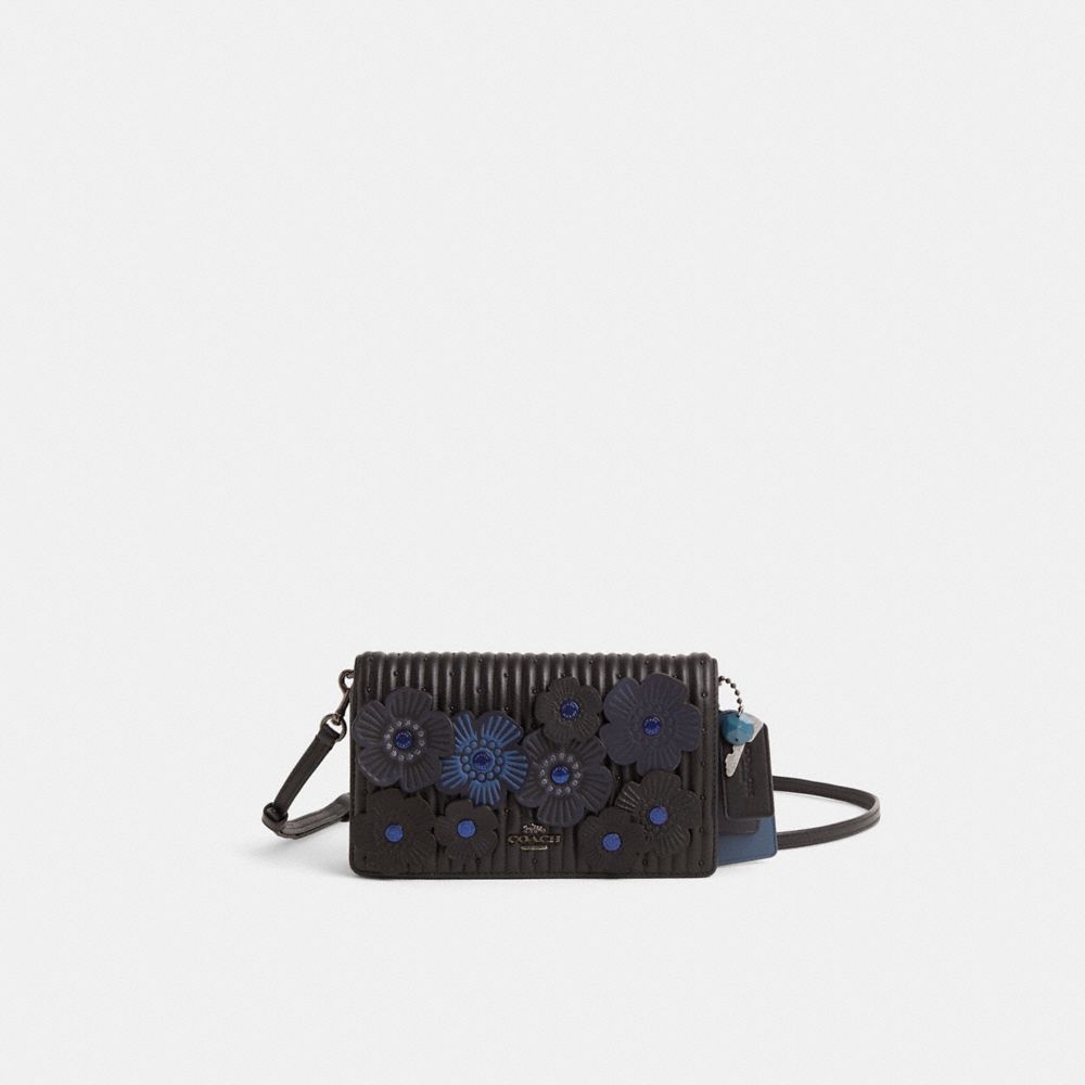 Reimagined with a darkly dramatic medley of our dimensional Tea Rose appliqué by Savannah Sutton, this foldover style has been expertly cleaned, conditioned and restored. Our talented craftspeople Ella Mulley, Jose Reyna and Yngrid Pichardo Baez embellished the front with die-cut leather blooms, polished the exterior, spot-painted the front pocket, replaced the D-rings, repaired the right gusset and edgestain, then added a long black leather strap and a playful repurposed charm. Easy, compact and practical—this perfect grab-and-go bag is crafted of soft nappa leather intricately detailed with rivets.