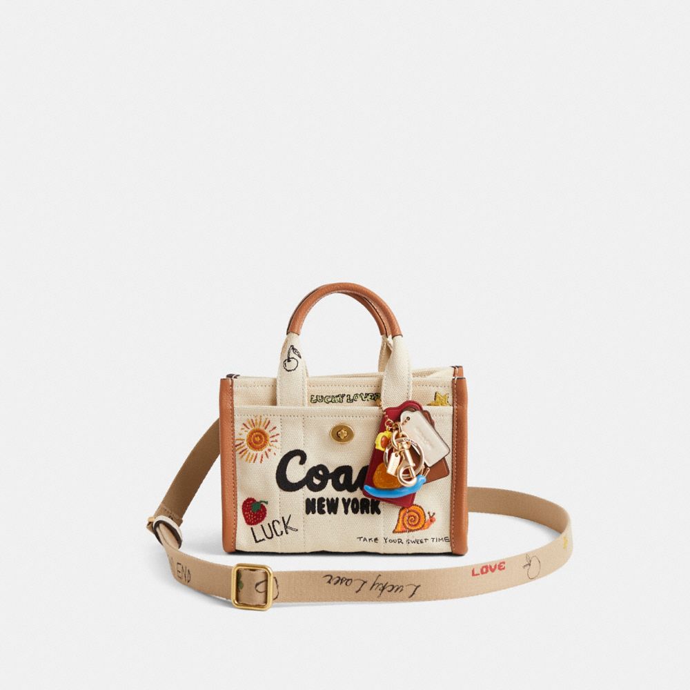 Reimagined by Rose Oliva with a pop of smooth brown leather at the handles for easy carry and on the binding and base for a luxe finish, this top-handle style has been expertly cleaned, conditioned and restored. Our talented craftspeople Fernando Gutierrez and Yngrid Pichardo Baez attached pop handle wraps, applied side binding and affixed a leather panel on the bottom in a matching shade, then added a playful repurposed charm cluster. Carry as much (or as little) as you like with our lightweight Cargo tote. Detailed with our iconic turnlock closure and cursive Coach script embroidery, this petite 20 features our Coach Sketch print, a playful doodle motif of whimsical drawings and phrases inspired by artistic notebook scribbling. It has an open interior with room for a phone, two outside pockets for easy organization and a removable recycled polyester webbing strap for shoulder or crossbody wear.