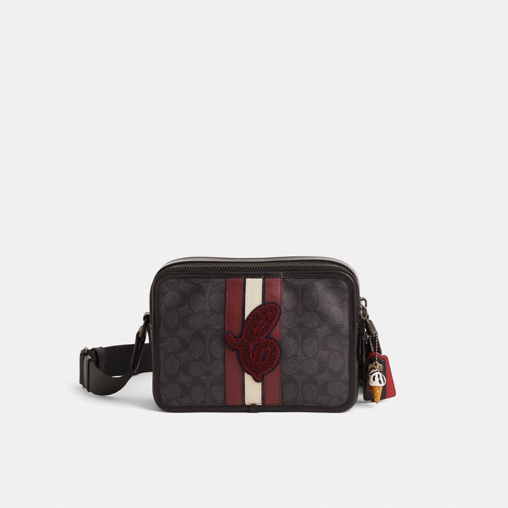 Reimagined by Rose Oliva with a sporty vibe featuring our Varsity Stripe in a trio of rich, contrasting hues, this hands-free style has been expertly cleaned, conditioned and restored. Our talented craftspeople Fernando Gutierrez and Yngrid Pichardo Baez embellished the front with a Coach Varsity Stripe and a single stripe in back, affixed our Coach script patch to the front, then added a playful repurposed charm. For adventures near and far, our Charter is designed to make every journey, commute and errand feel like a first-class experience. Crafted of our Signature canvas and refined leather, this structured crossbody has two zip compartments to keep you organized 24/7 and a lightweight adjustable webbing strap for versatile wear.