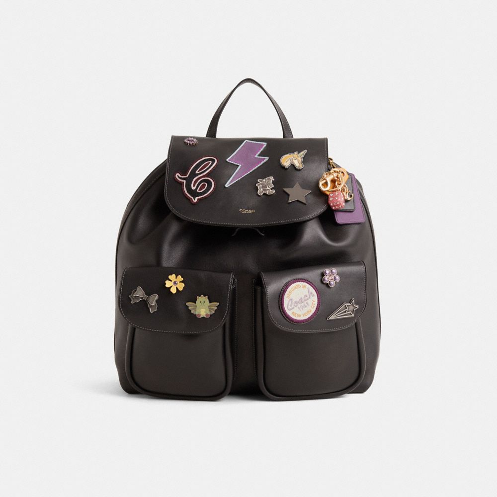Reimagined with a whimsical Varsity vibe by Savannah Sutton featuring a cool collection of Coach embellishments, this hands-free style has been expertly cleaned, conditioned and restored. Our talented craftsperson Nicole Izquierdo hand-decorated the flap and front pockets with eclectic patches and striking pins, refreshed the exterior, massaged the leather on the left pocket flap, then added a playful repurposed charm. Named for the captivating cobblestone street in New York City, the Crosby combines streamlined design with downtown style. A sophisticated take on a sporty silhouette, this backpack is crafted of natural grain leather with beautiful texture and soft feel. With two convenient exterior pockets and space for a 13" or 16" laptop, the interior drawstring and snap closure keep belongings secure, while adjustable shoulder straps ensure comfortable, all-day wear.