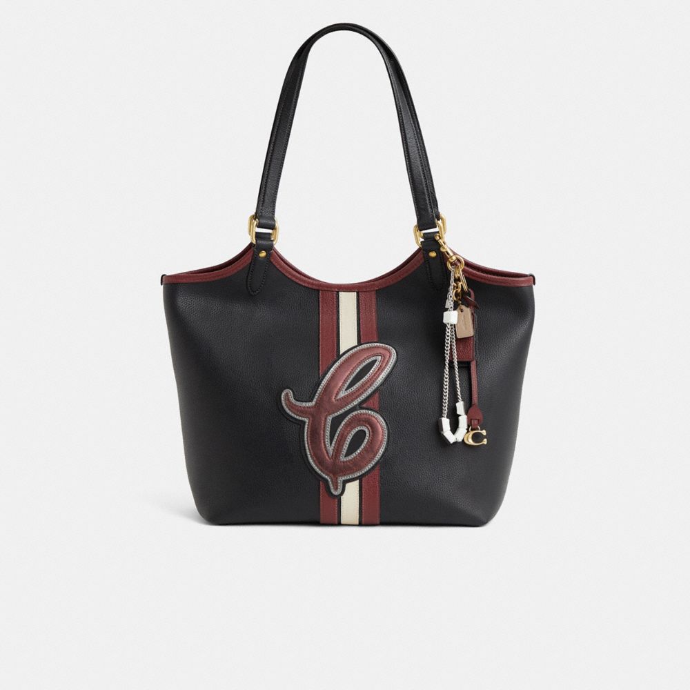 Reimagined by Rose Oliva with a sporty vibe featuring our Varsity Stripe in a trio of rich, contrasting hues, this generously sized style has been expertly cleaned, conditioned and restored. Our talented craftspeople Fernando Gutierrez and Yngrid Pichardo Baez embellished the front with a Coach Varsity Stripe and our metallic Coach script patch, replaced the binding in a matching hue, refreshed the interior and exterior, then added a playful repurposed charm. With its modern contours and roomy proportions, this tote is built to go wherever the day takes you. Crafted of polished pebble leather and our Signature canvas, it has plenty of room for all of the essentials, space for a 13" laptop, an easy-open snap closure and a convenient removable zip pouch.