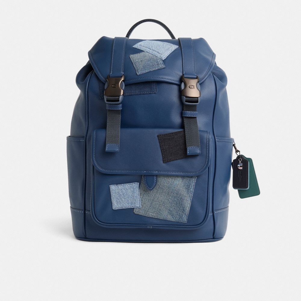 Reimagined with a casual-cool vibe by Rose Oliva featuring a dynamic denim patchwork in light-to-dark washes and hues, this sporty style has been expertly cleaned, conditioned and restored. Our talented craftsperson Fernando Gutierrez embellished the flap, front and pocket with a selection of Coach denim remnants, then added a playful repurposed charm. Made for a life in constant motion, the League is crafted of smooth leather and is a comfortable choice for every day with its padded back and straps. Organized with multiple pockets inside and out, it has a dedicated laptop sleeve and plenty of space for notebooks, water bottles and other essentials. An exterior zipper gives easy access to the main compartment.