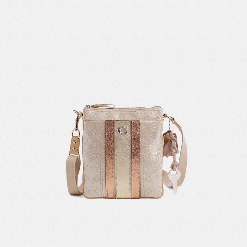 Reimagined with a distinctive Varsity Stripe in soothing metallic tones by Rose Oliva, this hands-free style has been expertly cleaned, conditioned and restored. Our talented craftspeople Fernando Gutierrez and Yngrid Pichardo Baez hand-decorated the front and back with a glowing Coach Varsity Stripe, refreshed the strap and piping, then added a playful repurposed charm. The perfect on-the-go bag, our Mia is crafted of embossed leather featuring our op art Signature motif. It has an open interior with a secure zip-top closure and an outside slip pocket.