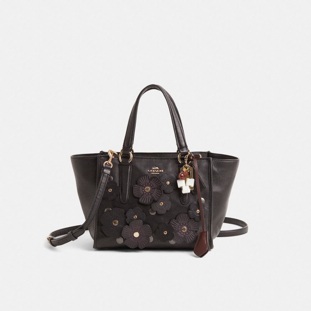 Reimagined with a darkly dramatic medley of our dimensional Tea Rose appliqué by Andrew Kaefer, this compact style has been expertly cleaned, conditioned and restored. Our talented craftspeople Ella Mulley and Nicole Izquierdo embellished the front with die-cut leather blooms and peek-a-boo rivets, replaced edge binding, D-rings and hardware on the long strap, refreshed edgestain at top edge, refreshed the exterior and interior, then added a playful repurposed charm. This Mini Crosby Carryall combines fashion and function in a classic silhouette with quiet branding and a diminutive Coach turnlock on the zipper pull. Crafted of hand-worked leather with a rich sheen, it’s finished with bound leather edges and a removable shoulder strap.