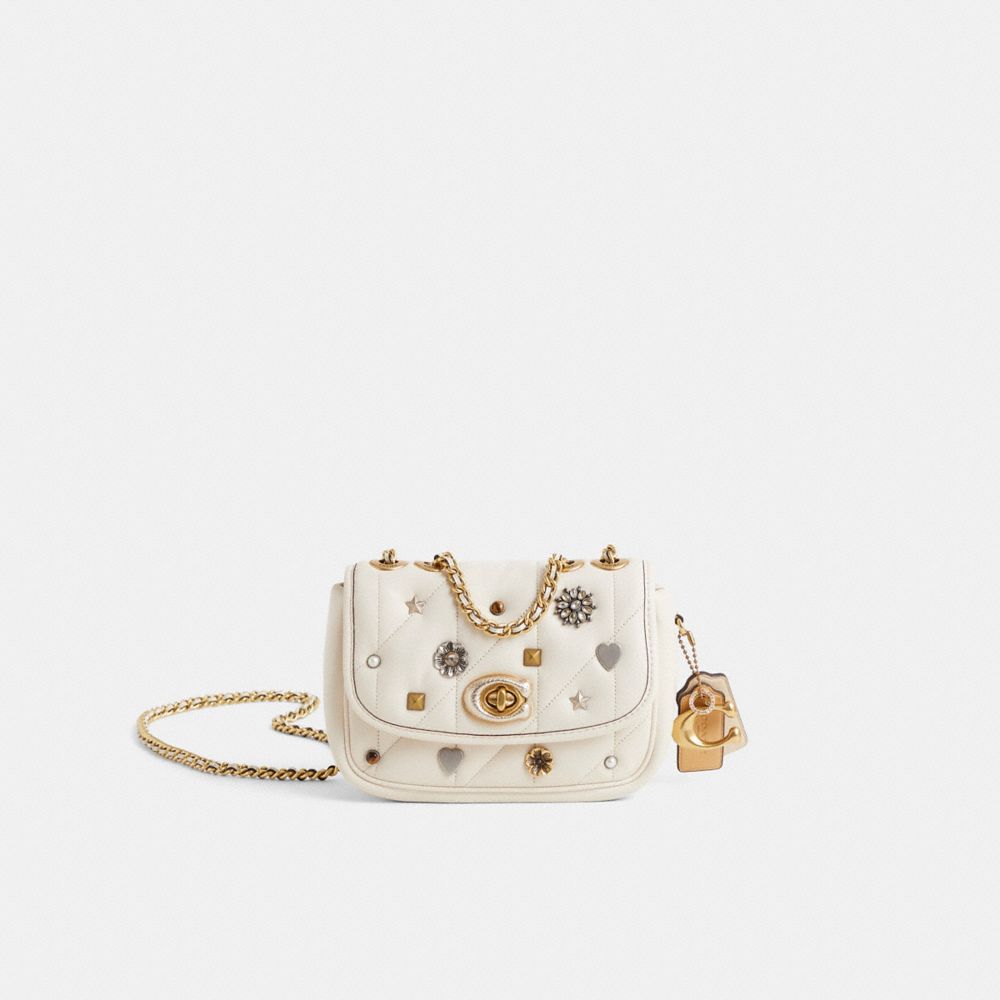 Reimagined with an opulent heirloom-jewelry inspired motif by Rose Oliva featuring a scattering of gleaming mixed-metal rivets, this flap-front style has been expertly cleaned, conditioned and restored. Our talented craftsperson Nicole Izquierdo hand-decorated the flap and front with polished Coach embellishments, covered the Signature hardware in metallic leather and added a playful repurposed charm. The Madison is a timeless style with modern proportions. Crafted of quilted plush, ultra-soft leather, this compact 18 is finished with multifunction pockets, an exterior slip pocket for easy access to essentials and our Signature turnlock closure. Convert the leather chain strap from long to two short handles.