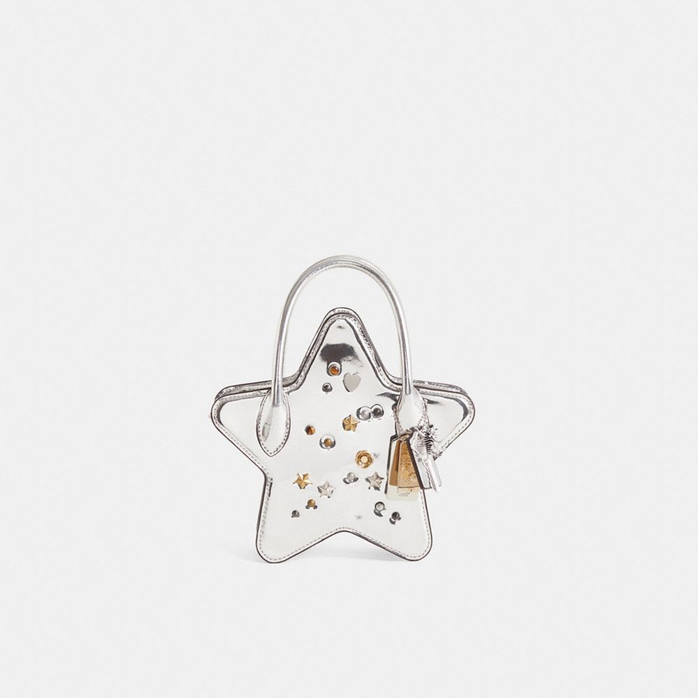 Reimagined with a smattering of mixed-metal accents by Eunice Chang featuring shining stars, gleaming hearts, a mini Tea Rose, pearly cabochons and scattered rivets for a brilliant finish, this whimsical style has been expertly cleaned, conditioned and restored. Our talented craftsperson Fernando Gutierrez hand-decorated the front and back with Coach embellishments and added a playful repurposed charm. Shine bright day or night with our Star bag crafted of lustrous mirror metallic leather. Designed to fit all your essentials, it can be carried by the top handles or worn crossbody.