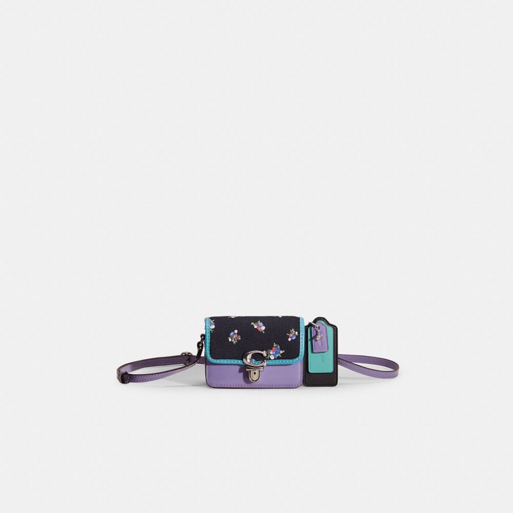 Reimagined with a splash of color featuring bright blue binding and a smattering of charming florals set against a navy background by Rose Oliva, this compact style has been expertly cleaned, conditioned and restored. Our talented craftspeople Jose Montero and Alfred Deaza applied a canvas remnant outlined with blue binding to the flap, refreshed the back pocket and added a playful repurposed charm. Finished with an archive-inspired Signature push-lock closure, our glossy patent leather Studio bag has room for cash, cards, lipstick, and keys. It comes with an adjustable strap for shoulder or crossbody wear.