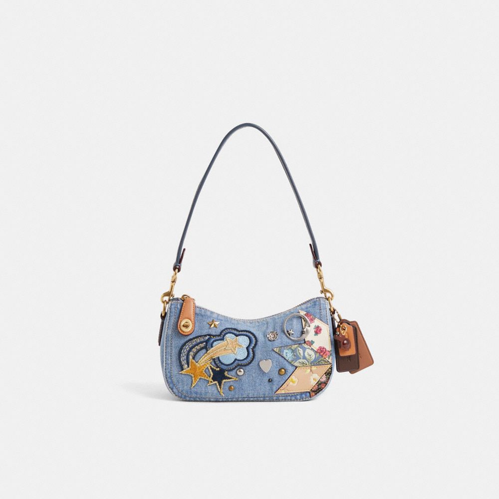Reimagined with an Americana crafting-inspired patchwork by Eunice Chang featuring nostalgic floral patterns, iconic Coach patches and a scattering of rivets, this streamlined style has been expertly cleaned, conditioned and restored. Our talented craftspeople Angel Penaloza, Nicole Izquierdo and Alfred Deaza hand-decorated the front with Coach remnants, patches and rivets, spot-painted the zipper pull and added a playful repurposed charm. The Swinger 20 is part of The Coach Originals, a collection of archival-inspired bags that celebrates our legacy and authentic New York heritage. Based on a 1980s Coach design reimagined for today, this casual-cool denim style features our iconic turnlock closure. This petite bag sits just beneath the underarm with the short-strap or it can be carried as a clutch.