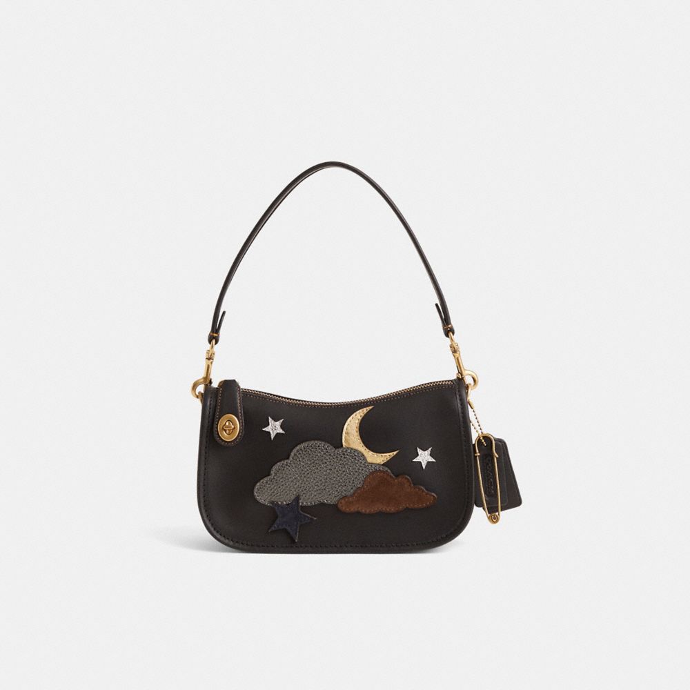 Artistically reimagined by Eunice Chang with a dreamy nighttime sky motif in front and dimensional Tea Rose appliqué in back, this streamlined design has been expertly cleaned, conditioned and restored. Our talented craftspeople Nicole Izquierdo, Alfred Deaza and Yngrid Pichardo Baez hand-embellished the front with playful leather, suede and metallic appliqué, attached riveted leather blooms to the back, refreshed the lining, then added a playful repurposed charm. The Swinger Bag is part of The Coach Originals, a collection of archival-inspired bags that celebrates our legacy and authentic New York heritage. This glovetanned leather style is based on a 1987 Coach design reimagined for today. Featuring our iconic turnlock closure, the zip-top short-strap shoulder bag sits just beneath the underarm for hands-free convenience and includes a detachable strap to wear crossbody.