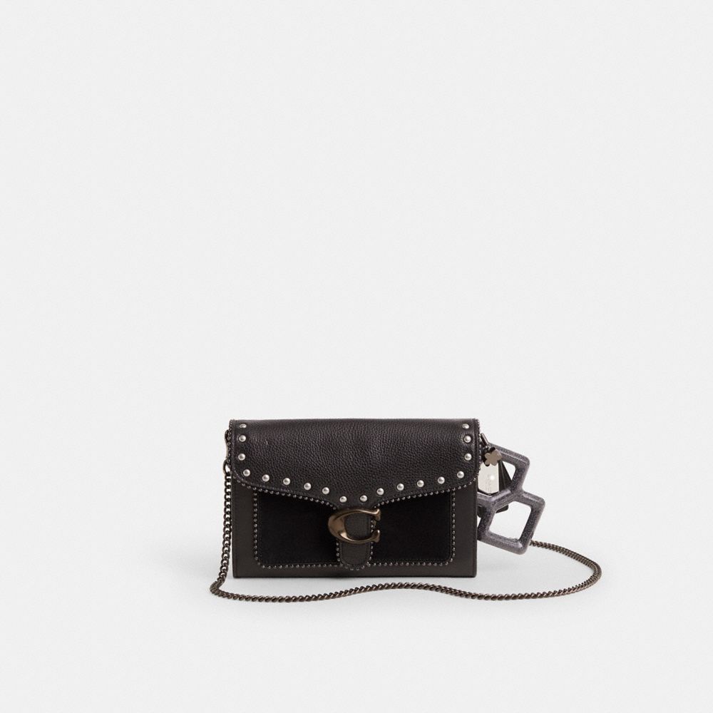 Reimagined with gleaming border rivets for an edgy-cool vibe by Savannah Sutton, this flap-front style has been expertly cleaned, conditioned and restored. Our talented craftsperson Alfred Deaza hand-decorated the flap with silvery studs, replaced the Signature hardware, closure, D-rings and dogleashes, refreshed the lining and back pocket, then added a playful repurposed charm. A modern take on an archival 1970s Coach design, our structured Tabby clutch is crafted in a mix of polished pebble leather, refined leather and suede detailed with gleaming beadchain trim. Finished with our Signature hardware, this organized, three compartment design has a secure interior zippered compartment and an exterior slip pocket. It can be carried as a clutch without the chain strap or worn crossbody.