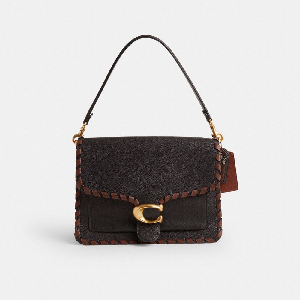 Reimagined with a distinctive textural edge featuring hand-laced brown whipstitching by Eunice Chang, this flap-front style has been expertly cleaned, conditioned and restored. Our talented craftspeople Ella Mulley and Yngrid Pichardo Baez embellished the flap and front with chunky whipstitching, replaced the hardware, refreshed the back, gusset, front and back pockets and lining, repaired the flap lining and gusset and the edgestain on the short and long straps, then added a playful repurposed charm. A modern take on an archival 1970s Coach design, our structured Tabby shoulder bag is crafted of polished pebble leather. Finished with our Signature hardware for an iconic touch, the versatile silhouette features two detachable straps to carry by hand, style as a short shoulder bag or wear crossbody.
