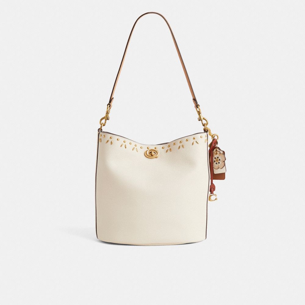 Reimagined by Rose Oliva with striking prairie rivets for a punctuated finish, this streamlined style has been expertly cleaned, conditioned and restored. Our talented craftspeople Nicole Izquierdo and Jose Reyna hand-decorated the front topline with golden border studs, then added a pop leather shoulder strap and a playful repurposed charm. Not too big, not too small, Willow is the perfect go-anywhere shoulder bag with space for all of your day-to-day essentials. Crafted of polished pebble leather, the generously sized Soft Bucket Bag has an organized interior with one zip compartment, two open compartments and a pocket for small necessities. It secures with our Signature turnlock closure and can be carried by hand, on the shoulder or crossbody.